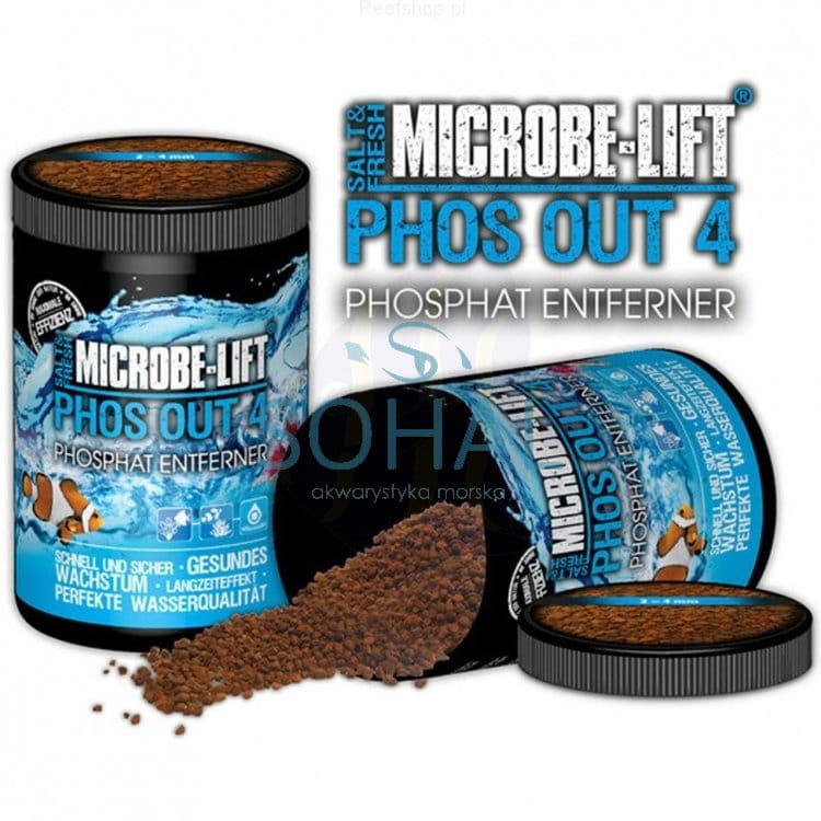 Microbe-lift Phos-Out4 to materiał filtracyjny w formie granulatu usuwający z wody fosforany, krzemiany, siarczany oraz garbniki. Szybko, permanentnie oraz w bezpieczny sposób usuwa niechciane składniki z wody powodując wyraźne polepszenie parametrów wody. Microbe-lift Phos-Out4 jest skuteczny szczególnie w usuwania fosforanów (PO4) nie powodując przy tym groźnych wahań odczynu wody (pH). Microbe-lift Phos-Out4 szybko wspomaga wzrost zwierząt w razie wystąpienia problemów z fosforanami lub rozwojem niechcianych glonów, jest produktem opartym na wodorotlenku żelaza. Dawkowanie: 50 ml na 100l wody akwariowej Wskazówki: - zacznij stosowanie produktu od zalecanych dawek, w razie dalszych problemów z fosforanami stopniowo zwiększaj dawkę - przed zastosowaniem, przepłucz pod bieżącą wodą kranową - optymalne stężenie fosforanów w akwarium morskim powinno mieścić się w granicach od 0,02 do 0,05mg/l - zalecamy umieścić produkt w miejscach silnego przepływu wody np. filtrach zewnętrznych lub wewnętrznych, sumpach lub filtrach przepływowych - zalecamy regularne stosowanie Microbe-lift Substrate Cleaner w celu usuwania nadmiaru fosforanów z akwarium (podczas stosowania wyjmij Phos-Out4 z wody aż do momentu powrotu przeźroczystości)
